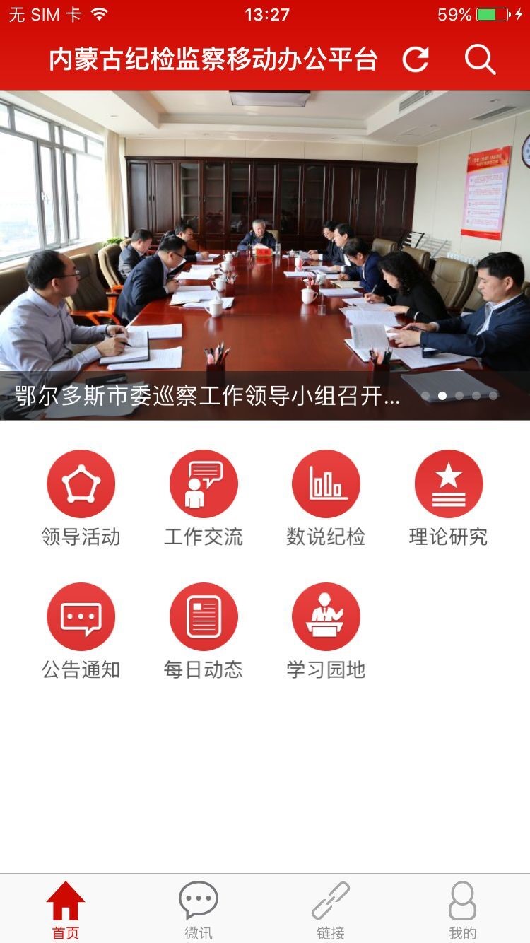 内蒙古自治区纪检监察移动办公平台利用外网服务器,只要有移动设备,不论何时何地,均可轻松办公,及时了解单位动态。平台内涵盖了领导活动、公告通知、每日动态、工作交流、理论研究、微课堂、数说纪检、微讯、链接等多个应用功能。
